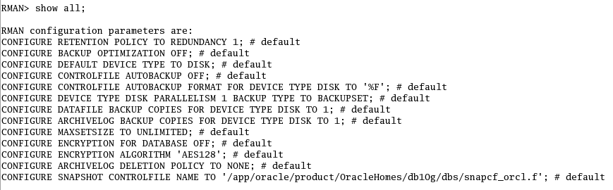 Configure backups to be written to diskCONFIGURE DEFAULT DEVICE TYPE TO DISK;Configure RMAN to keep at least 5 backups of each datafile. If you have certain backups which must be retained longer than this retention policy, you can use the KEEP option with the BACKUP command when creating those backups. CONFIGURE RETENTION POLICY TO REDUNDANCY 5;Configure RMAN to use two disk channels for backup, restore, recovery, and maintenance operations. CONFIGURE DEVICE TYPE DISK PARALLELISM 2;Configure RMAN to write disk backups to the /backup directory. The format specifier %t is replaced with a 4-byte timestamp, %s with the backup set number, and %p with the backup piece number. CONFIGURE CHANNEL DEVICE TYPE DISK FORMAT '/backup/ora_df%t_s%s_s%p';Configure RMAN to back up the control file after each backup. CONFIGURE CONTROLFILE AUTOBACKUP ON;Configure RMAN to write controlfile autobackups to the /backup directory.br> CONFIGURE CONTROLFILE AUTOBACKUP FORMAT FOR DEVICE TYPE DISK TO '/backup/ora_cf%F';Excludes tbs_exclude from full database backups. NOEXCLUDE can be specified with the BACKUP command to override this configuration. CONFIGURE EXCLUDE FOR TABLESPACE tbl_exclude;NOTES: If you want backups to go to tape, refer to the configuration section in case2.rcv on how to configure tape backups. However in case of disaster recover if RMAN is not connected to recovery catalog, you will have to manually allocate all channels where backups were taken. - Use the SHOW ALL command to see your current configuration settings. - Save the database id displayed in the RMAN output if you are taking RMAN backups in nocatalog mode or database name is ambiguous in recovery catalog. The database id is required during disaster recovery (See Section 5). You will see the database id in RMAN output on connecting to target database like :